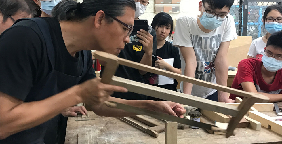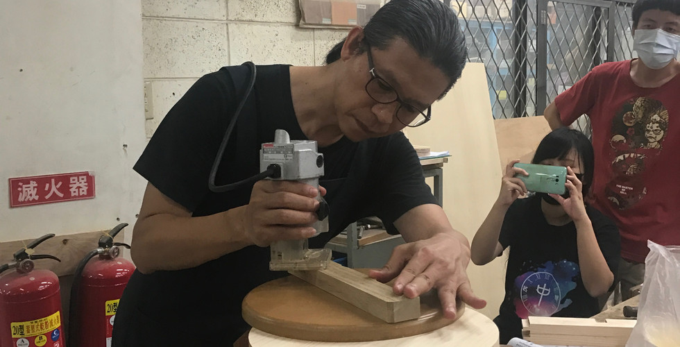 看完示範之後就要進行木椅的製作。有很多機械操作都已經是助教幫我們調好的,所以在操作上只需要按照SOP就可以完成。老師為了讓我們接觸到四大工法,因此與阿農師傅一起為我們示範要如何用傳統的「鋸」「鑿」來完成榫頭的部分。